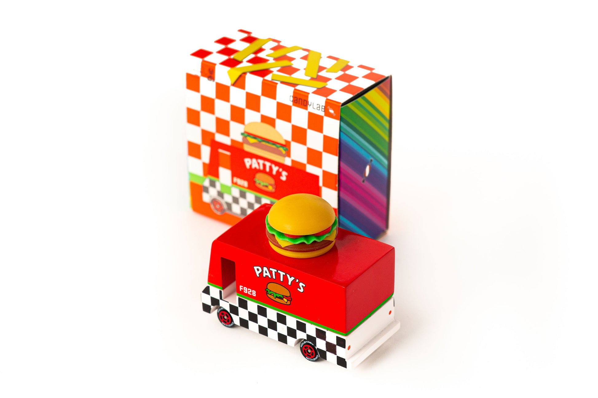 A beautifully made collectible wooden diecast Candycar® Van in a fun design featuring a cute silicone hamburger topper designed for play.