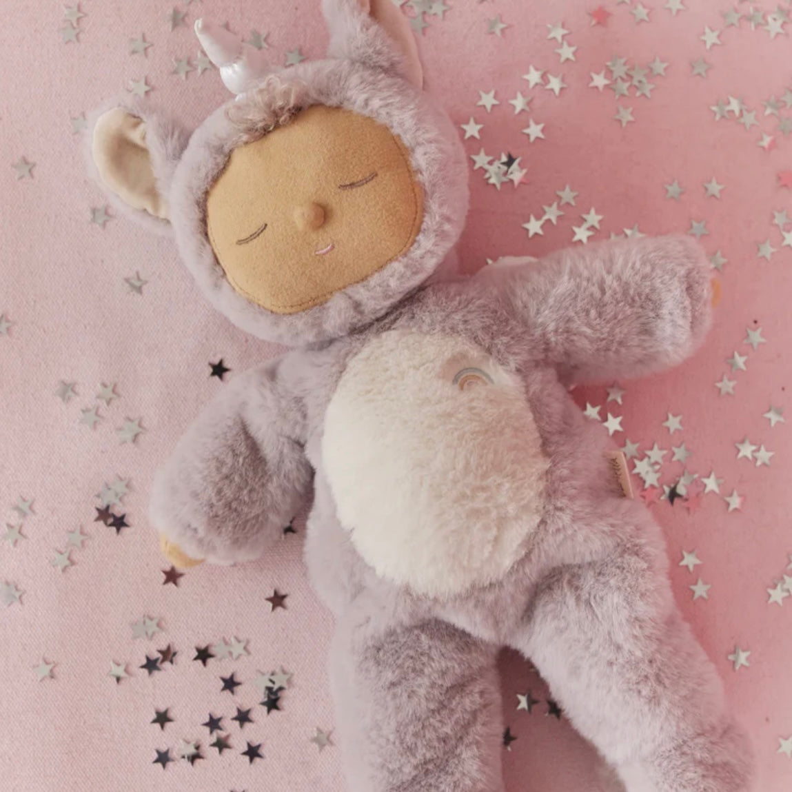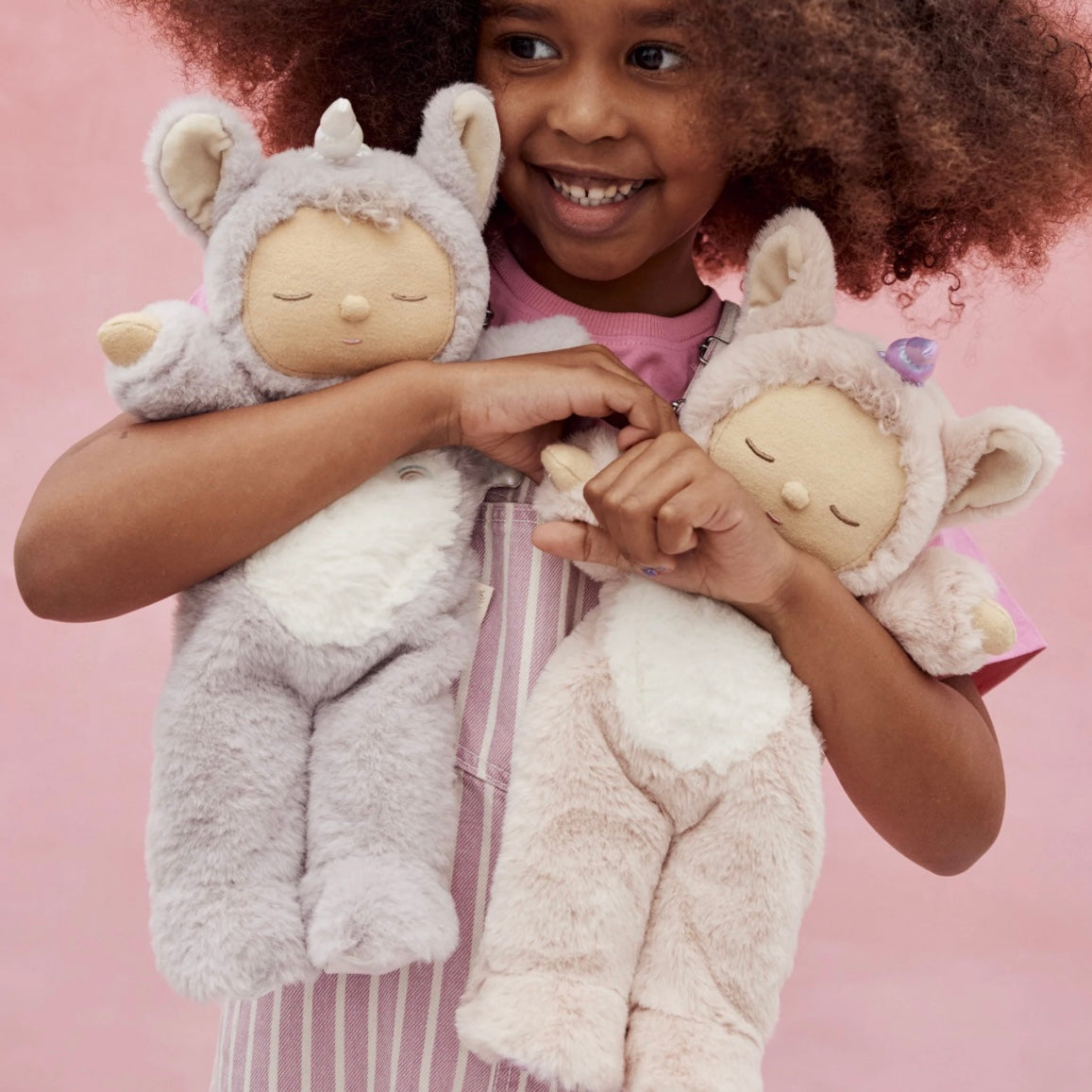 Meet Sweetpea. A cuddly unicorn Cozy Dinkum doll by Olli Ella snuggled in the softest lilac coloured suit complete with a horn and wings. Sweetpea is fast asleep and ready for snuggles and cuddles. Made from the softest material with posable arms and legs and a weighted head. Sweetpea has the sweetest embroidered face with a tuft of curly hair and wears a non-removable onesie with a rainbow over the heart.