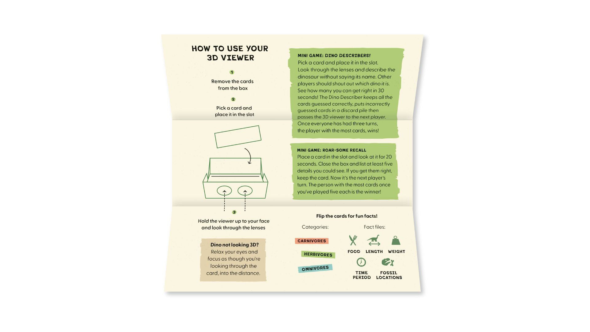 See 30 dinosaurs in incredible 3D with this immersive viewer – including a charging triceratops, and a T-Rex mid-roar! Choose a dinosaur card and place it in the box, then look through the glasses to enter the world of the dinosaurs. Turn over the cards to discover fun facts and observation games. Kit contains: 3D lenses, 30 dinosaur cards, and an instructions and games leaflet.