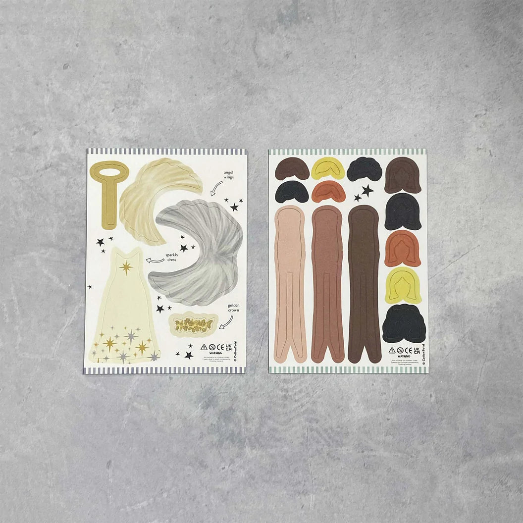 Perfect for three years & upwards, children will love to create their very own Angel. Gently push the pre cut shapes out from the sheets, then choose the accessories you love the most. The Angel comes with a dress, wings, crown and halo, together with a choice of skin tones and hairstyles for further personalisation. Stick the chosen items onto the peg with the glue dots provided to create your doll and a little bit of Christmas magic! Your angel will look great on a shelf or even as a decoration on the Christmas tree.