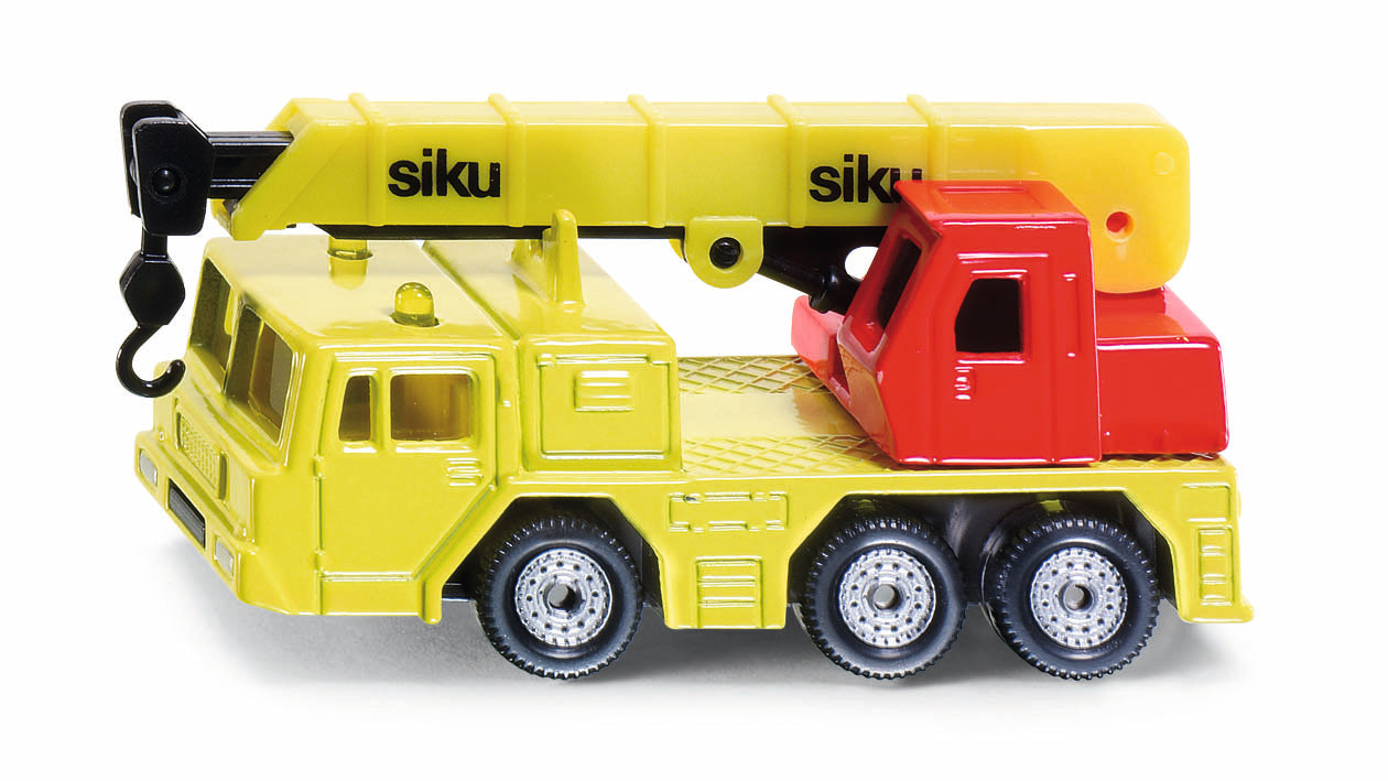 A toy crane with a movable jack and hook for easy gripping and rubber tires allowing it to move on various surfaces by Siku.