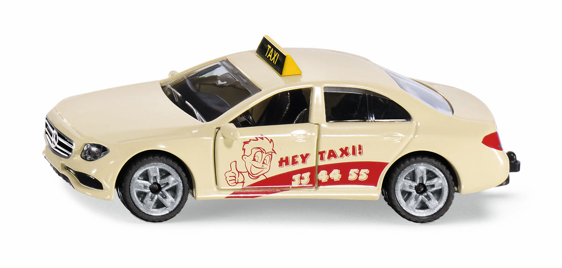 A fun Mercedes-Benz toy taxi with opening doors with peppy and cheerful prints on the side of the vehicle by Siku.